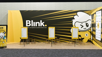 Die besondere Herausforderung: Erstmals bespielt Blink auf der CMS zwei Standflächen, die räumlich durch einen Eingang getrennt sind. Bloom löste dies mit einer starken architektonischen Idee: Die bekannte Blink-Sonne wurde zum verbindenden Mittelpunkt, ergänzt durch ein symmetrisches Linienspiel, das beide Flächen zu einem großen Ganzen verschmilzt.